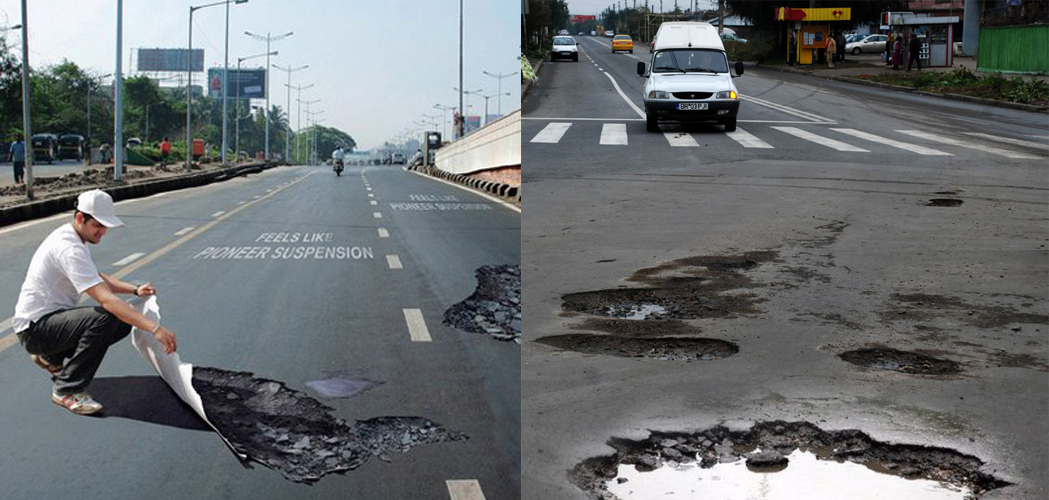 Canadienii folosesc afișe tridimensionale sub forma unor gropi care obligă mașinile să încetinească. În România folosim gropile din asfalt, fără să mai aruncăm banii pe afișele scumpe.